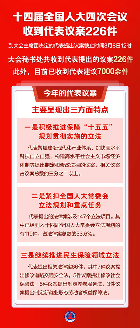 新华社北京3月10日电 记者3月10日从十四届全国人大四次会议秘书处获悉,到大会主席团决定的代表提出议案截止时间3月8日12时,大会秘书处共收到代表提出的议案226件。此外,大会秘书处目前已收到代表建议7000余件。